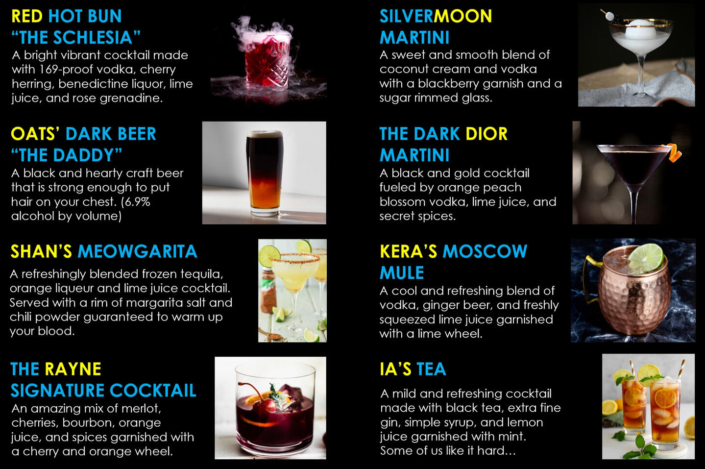 Thirsty? Our signature cocktails and house brewed beer are always the best way to stay cool. Ask one of our waitresses for a menu.Menus are available via a direct wifi connection in addition to our website.